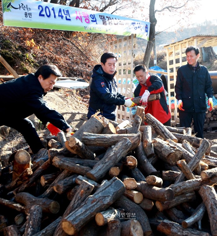 최근 경기 용인시는 산림 부산물을 겨울철 난방용으로 지역내 저소득계층에 전달하는 '사랑의 땔감나누기' 행사를 열었다. 행사에서는 정찬민 시장과 공무원들이 20톤가량의 통나무 땔감을 전달했다. 사진은 땔감나누기 행사에서 참여자들이 목재를 옮기는 모습.(사진제공=용인시청)