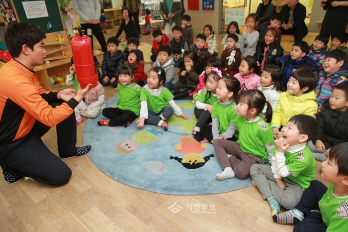 지난 14일 서울 구로소방서는 구로구육아종합지원센터 3층 발견놀이터에서 어린이집 원생과 보육교사 등을 대상으로 '소방관이 찾아가는 소방안전 체험교육'을 실시했다. 사진은 이날 교육에 참가한 원생들이 소방관에게 안전교육을 받고 있는 모습. (사진제공=구로소방서)
