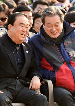 16일 오후 서울 여의도 국회 본청 앞 잔디광장에서 열린 ‘원코리아 뉴라시아’ 자전거 평화대장정 원정대 입성식 및 축하행사에서 새누리당 김무성(오른쪽) 대표와 새정치민주연합 문희상 비상대책위원장이 참석해 대화를 나누고 있다.