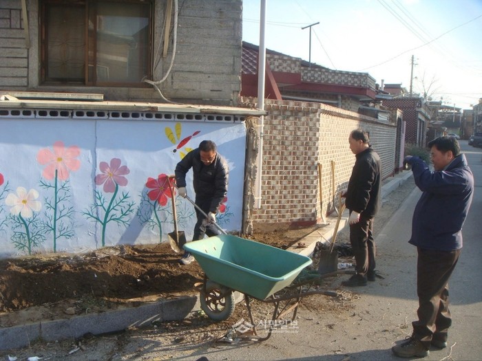 경기 동두천시 보산동 주민자치회는 최근 거리 미관을 저해하는 쓰레기 투기 장소에 '2014년 보산동 벽화사업 및 환경정화 활동'을 실시했다. 사진은 주민자치회원이 벽화작업을 마무리한 후 잡풀을 제거하는 모습. (사진제공=동두천시청)
