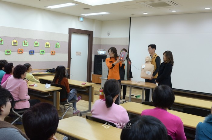 17일 서울 영등포소방서는 오전 구립영등포노인케어센터내 강당에서 센터 관계자들을 대상으로 비상상황이 발생했을 때의 대처능력을 높이기 위해 소화기·자동제세동기 사용법, 하임리히법 등으로 구성된 소방안전교육을 실시했다. 사진은 자동제세동기 사용법을 강의 중인 소방관의 모습.(사진제공=영등포소방서)