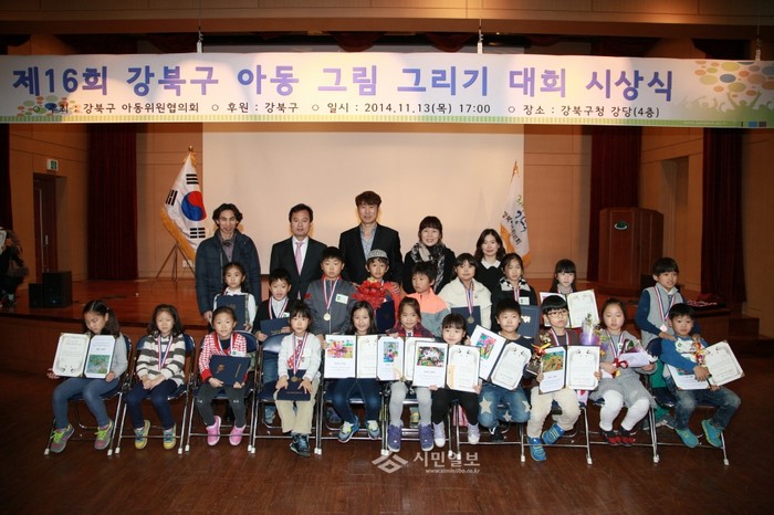 지난 13일 서울 강북구 구청 대강당에서 ‘제16회 아동그림그리기 대회’ 시상식이 열렸다. 이번 대회는 '가족', '가을풍경'이라는 주제로 지난 10월18일 진행됐다. 사진은 수상한 어린이들과 기념촬영을 하고 있는 박겸수 강북구청장(맨 뒷줄 왼쪽에서 두번째)의 모습.