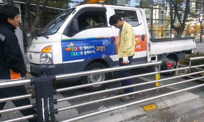 경기 고양시는 최근 경기도, 일산소방서와 합동으로 지역내 공동구 환풍구 34곳에 대해 안전 점검을 실시했다. 사진은 확실한 안전성 확인을 위해 1톤 화물차량을 이용, 환풍구 상부 하중시험을 진행 중인 모습. (사진제공=고양시청)