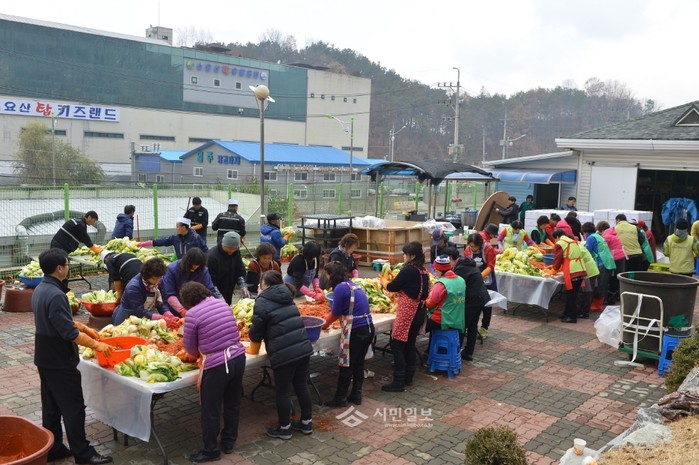 경기 동두천시 생연1동 남여새마을지도자회는 지역내 저소득층의 겨울나기를 돕기 위해 지난 여름부터 직접 재배한 배추 1600포기로 김장김치를 만드는 '사랑의 김장 담그기 행사'를 실시했다. 사진은 행사에 참여한 봉사자들이 김장김치를 담그는 모습. (사진제공=동두천시청)