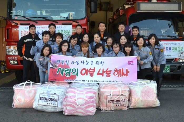 인천남동소방서 119구조대는 만월여성의용소방대와 함께 19일 만수동에 거주하는 불우이웃가정 10가구를 방문해 겨울철 이불을 전달했다. 사진은 이날 '사랑의 이불 나눔 행사'에 참여한 봉사자들이 이불을 전달하기 전 기념촬영한 모습. (사진제공=인천남동소방서)