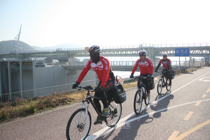경기 여주소방서는 19일 안전하고 쾌적한 자전거 문화조성을 위해 홍영근 여주소방서장을 비롯한 15명의 소방직원이 참가한 가운데 '안전사고 예방 캠페인 및 적응훈련'을 남한강 자전거길 일대에서 실시했다. 사진은 소방직원들이 남한강 자전거길에서 적응훈련 및 순찰을 실시하고 있는 모습. (사진제공=여주소방서)