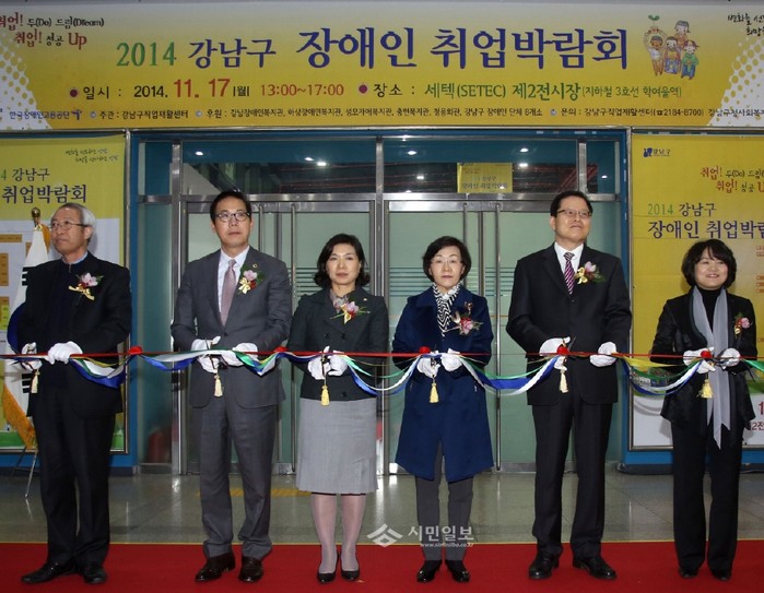 지난 17일 오후 3시 서울 강남구 SETEC 2전시장에서 열린 ‘2014년 강남구, 장애인 취업박람회’에 신연희 강남구청장(오른쪽에서 세번째)이 참석해 내빈들과 테이프 커팅을 하고 있다. (사진제공=강남구청)