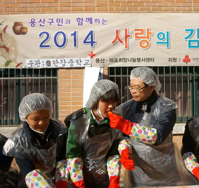 지난 18일 성장현 용산구청장이 한강중학교에서 학생 및 학부모, 교직원 등이 참여한 가운데 진행된 ‘사랑의 김장 나눔’ 행사에 참석해 학교내 텃밭에서 학생들이 직접 재배한 배추 300여포기를 가지고 김장을 했다. 사진은 성 구청장이 옆의 학생에게 김치를 먹여주고 있는 모습. (사진제공=용산구청)