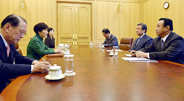 20일 오후 청와대에서 박근혜 대통령이 새누리당 김무성 대표와 이완구 원내대표, 주호영 정책위의장 등과 회동하고 있다.