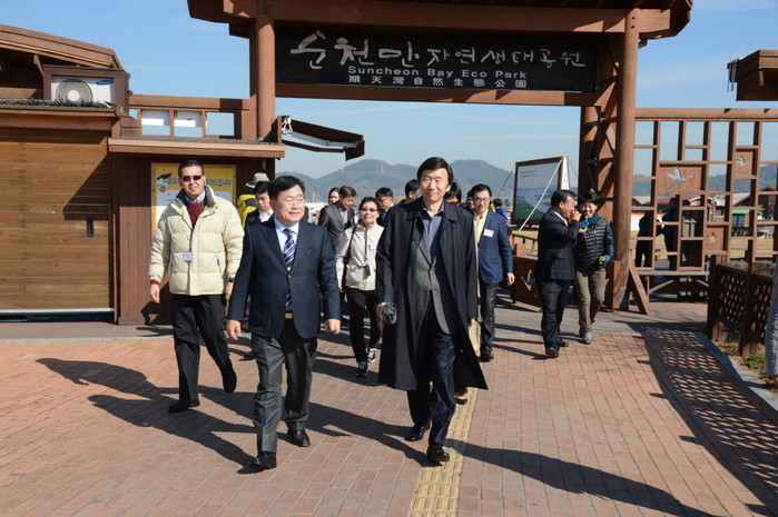 지난 19일 주한 외교단 및 국제기구 대표 부부 등 130여명이 순천만정원을 방문한 가운데 조충훈 순천시장과 이정현 국회의원이 이들을 안내하고 있다. 주한 외교단은 '역동적인 남해안'이라는 주제로 지난 18일부터 1박2일 일정으로 경남 사천과 남해를 거쳐 순천만정원과 순천만자연생태공원을 찾았다.