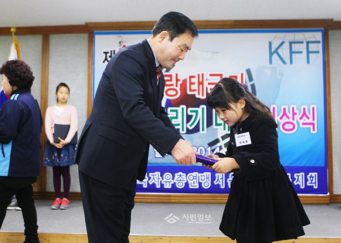 지난 19일 서울 송파구청 대회의실에서 열린 ‘제1회 나라사랑 태극기 그림 그리기 대회’에 참석한 임춘대 송파구의회장이 우수작품을 출품한 한 초등학생에게 표창장을 수여하고 있다.(사진제공=송파구의회)
