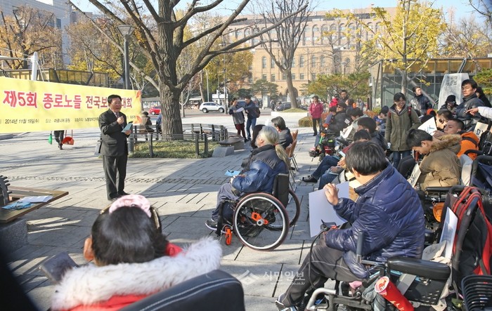 지난 19일 서울 종로구 마로니에 공원에서 개최된 ‘제5회 종로노들 전국 보치아 대회’에 김복동 종로구의회장이 참석해 참가자들에게 축사를 하고 있다. (사진제공=종로구의회)
