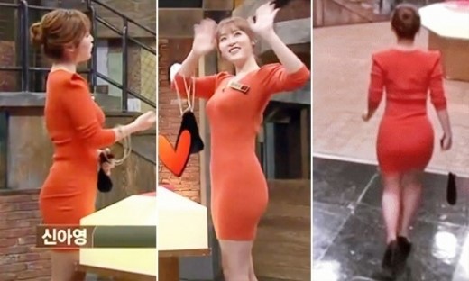 방송에서 몸매가 드러나는 오렌지 색의 밀착 원피스 차림으로 등장했던 신아영은 끝까지 S라인 명품 몸매를 뽐내 프로 의식을 선보였다.