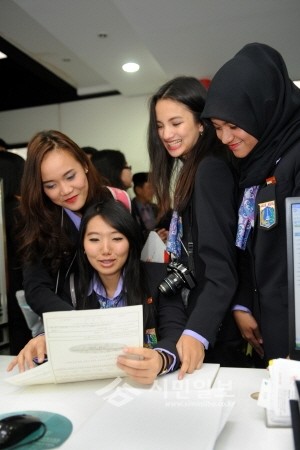 21일 송파구청의 '사회적기업 운영과정' 견학을 위해 구청을 방문한 인도네시아 자카르타 대표단이 일자리센터에서 신청서 작성 등의 구직체험을 하고 있다.(사진제공=송파구청)