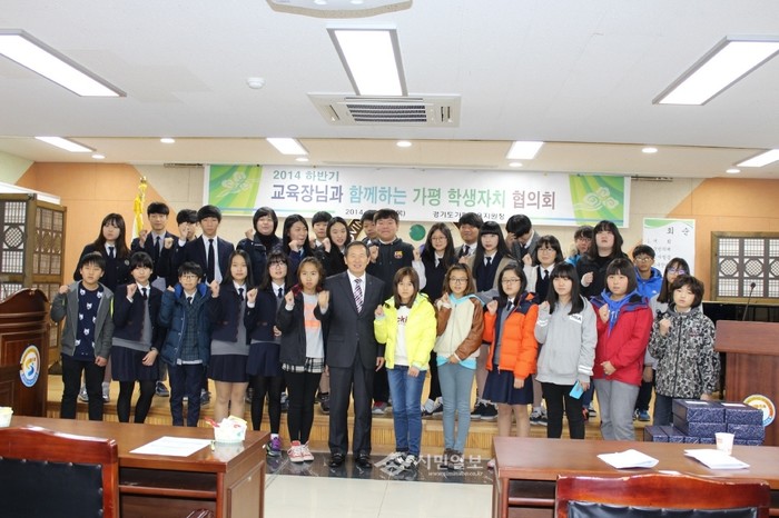 경기도 가평교육지원청은 최근 지역내 초·중·고교 학생, 청소년상담복지센터, 학생자치협의회 위원을 대상으로 '2014 학생이 중심이 되는 꿈을 찾는 가평학생 토론회'(우리교육청 2층 물회의실)를 실시했다. 사진은 이날 참가한 학생들이 토론회가 끝난 후 황중원 교육장과 함께 기념촬영한 모습. (사진제공=경기도가평교육지원청)