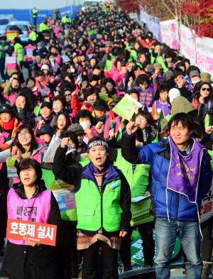 21일 오전 서울 종로구 서울시교육청 앞에서 열린 '서울지역 학교비정규직 총파업투쟁'에서 서울지역 학교비정규직 조합원들이 '비정규직 철폐 및 호봉제 전환'을 요구하며 구호를 외치고 있다.