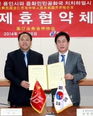 정찬민 경기 용인시장과 순저 중국 치치하얼시장은 20일 오후 4시 용인시청 정책토론실에서 이우현 국회의원, 양도시 관계공무원 등이 참석한 가운데 우호도시의향서를 교환했다. 사진은 이날 우호도시의향서를 교환한 후 기념촬영한 정 시장(왼쪽)과 순저 시장의 모습. (사진제공=용인시청)