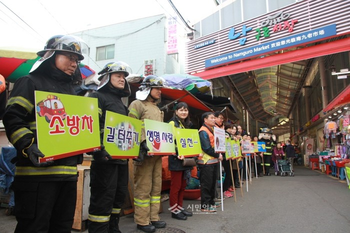 서울 구로소방서는 최근 ‘11월 전국 불조심 강조의 달’을 맞아 구로구 구로4동에 위치한 남구로시장 일대에서 소방펌프차 등 차량 2대와 소방공무원 14명, 의용소방대원 26명을 비롯해 구청, 경찰, 시장 관계자 등이 참여한 가운데 겨울철 황금시간 목표제 실현을 위한 '민·관합동 불조심 가두캠페인'을 실시했다. 사진은 시장 입구에서 피켓을 들고 홍보활동에 들어간 참가자들의 모습. (사진제공=구로소방서)