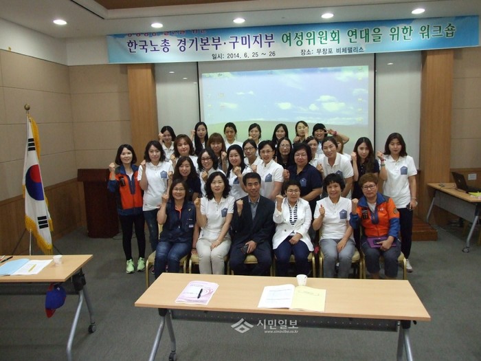 | ▲ 지난 6월 새로운 노사문화 패러다임을 선도할 핵심 지도자를 육성하기 위해 열린 워크숍의 참여자들이 기념촬영 한 모습.(사진제공=구미시청) | ||