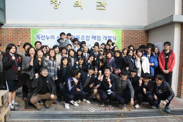 지난 21일 서울 금천구 독산고등학교에서 서울시내 고등학교 중 최초로 사회적협동조합이 운영하는 학교매점 개점식이 열렸다. 이 조합은 학생, 학부모, 교사, 인근주민들이 모두 참여해 윤리적 경제활동, 소통·나눔 교육을 실천하는 교육경제공동체다. 사진은 매점 개점식에 참여한 조합 관계자들의 모습.(사진제공=금천구청)