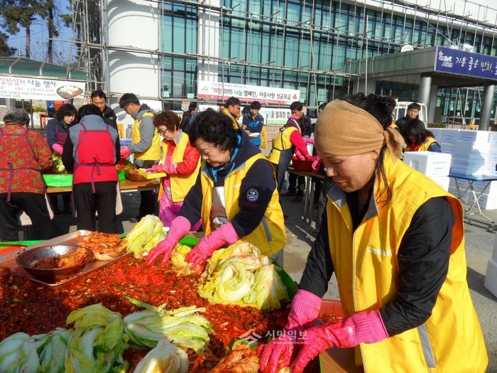 충남 아산시 도고면 행복키움추진단이 지난 20~21일 도고면사무소 앞에서 봉사자 50여명이 참여한 가운데 500포기의 김장김치를 담가 기초생활보장수급자 등 저소득층 100여가구에 전달하는 '희망·사랑의 김장나눔 행사'를 열었다. 사진은 참여자들이 김장김치를 만드는 모습.(사진제공=아산시청)