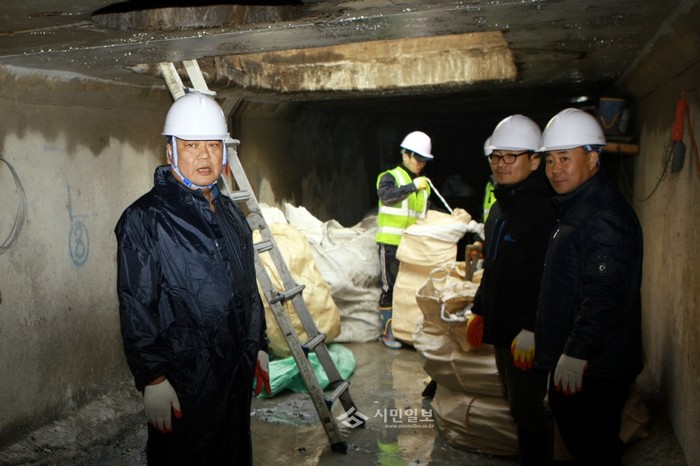 서울 강북구의회 장동우 부의장은 최근 가오천(국립재활원~광산사거리 구간) 하천 BOX 내부 오수관(차집관거) 성능개선 공사 현장방문에 나서 내부를 돌아보고 관계자에게 공사에 대한 설명을 들었다. 사진은 장 부의장(왼쪽)이 관계자들과 함께 내부를 둘러보는 모습. (사진제공=강북구의회)