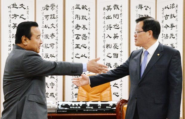 정의화 국회의장이 24일 오전 서울 여의도 국회 의장 집무실에서 예산안 관련 새누리당 이완구 원내대표와 만나고 있다.