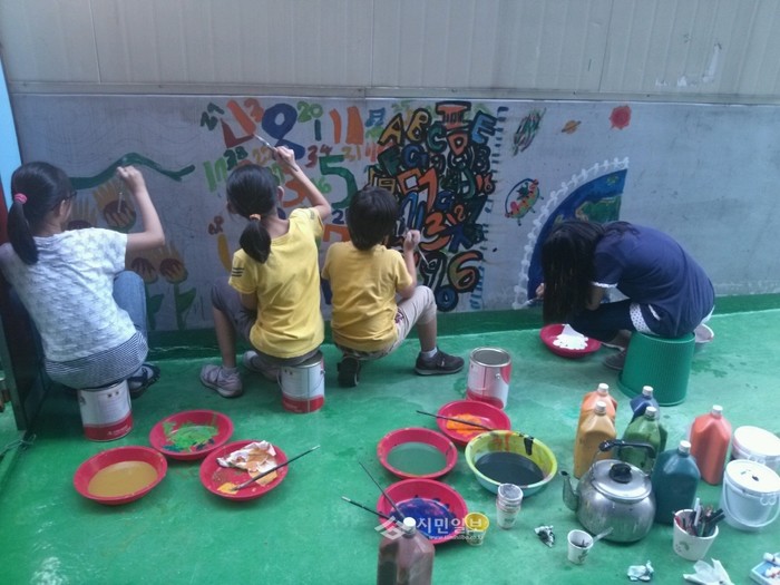 | ▲ 마을학교 사업에 참여한 아이들이 직접 벽화를 그리고 있는 모습. (사진제공=노원구청) | ||