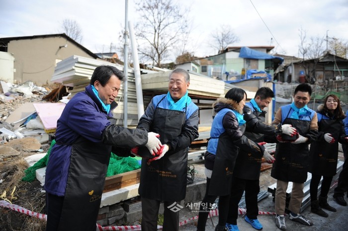 25일 서울 중랑구가 (사)따뜻한한반도사랑의 연탄나눔운동, 아주복지재단 임직원 등과 함께 신내1동 새우개마을 앞에서 사랑의 연탄나눔행사를 진행했다. 사진은 이 행사에 참석한 나진구 중랑구청장(왼쪽)과 아주산업 문규영 회장(오른쪽)이 연탄을 운반하는 모습. (사진제공=중랑구청)