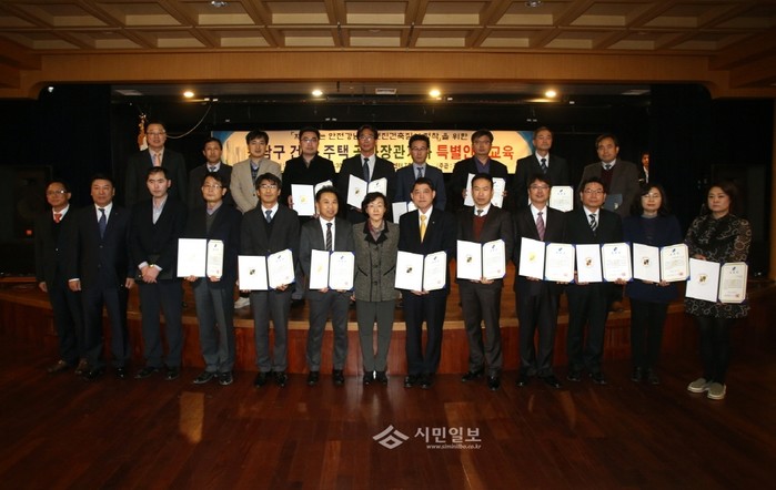 신연희 서울 강남구청장(앞줄 오른쪽에서 일곱 번째)이 지난 24일 오후 3시 강남구 논현2문화센터에서 열린 ‘건축 공사장 관계자 특별안전교육’에 참석해 환경정비 등 관리가 우수한 공사장에 감사장을 수여하고 수상자들과 기념촬영을 하고 있다.(사진제공=강남구청)