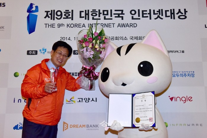 경기 고양시가 지난 24일 대한상공회의소에서 열린 '제9회 대한민국 인터넷대상' 시상식에서 인터넷 사회진흥 분야 미래창조과학부 장관상을 받았다. 사진은 최성 시장(왼쪽)과 고양시 마스코트가 시상식 후 기념촬영을 하는 모습. (사진제공=고양시청)