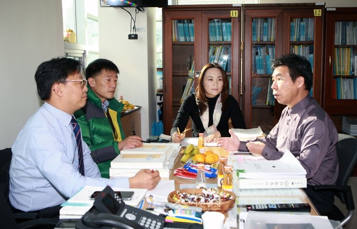 지난 25일 서울 강북구의회 박문수 의원(오른쪽)이 2015년 본예산 심의에 앞서 초선의원 3명을 대상으로 다음 회기인 제184회 제2차 정례회 때 진행될 예산심의 사전준비를 위해 예산심의기법과 실전 노하우에 대한 토론을 진행했다. 사진은 참석한 의원들이 토론하고 있는 모습. (사진제공=강북구의회)