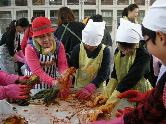 26일 경기 부천시 부원초등학교는 우리 문화를 이해하고 사랑을 나누고자 학교에서 직접 기른 배추로 활용, 교내 과학1실에서 학부모회의 도움을 받아 '김장 담그기' 행사를 진행했다. 사진은 이날 행사에 참여한 아이들과 학부모회 어머니들이 김치를 담그고 있는 모습. (사진제공=부천교육지원청)