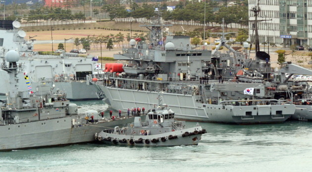 방산비리의 상징으로 떠오른 차기수상함 구조함(ATS-Ⅱ)인 '통영함'(3500t급)을 해군이 조기에 인수하도록 군이 추진키로 해 논란이 일고 있는 가운데 26일 오전 부산 남구 해군작전사령부 부산작전기지 부두에 통영함(맨 오른쪽)이 정박 중이다.