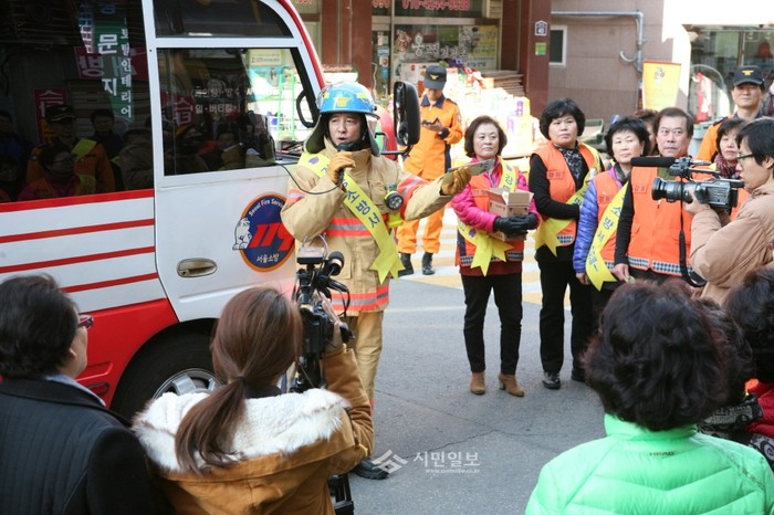 지난 26일 서울 강동구가 '길이 열리면 생명이 열립니다'란 주제로 '소방차 길 터주기 캠페인'을 실시했다. 이날 이해식 구청장은 직접 소방서를 타고 암사종합시장까지 가상출동하며 관련 내용을 홍보했다. 사진은 이 구청장이 소방차 길터주기 관련 내용을 주민들에게 알리는 모습. (사진제공=강동구청)