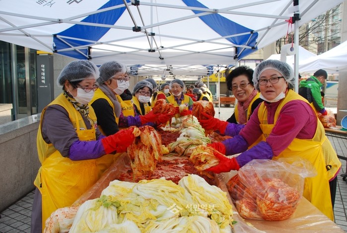 지난 11월27일 서울 마포구 마포아트센터 앞마당에서 대한적십자사 봉사회 마포지구협의회 봉사단원 80여명은 겨울을 맞아 지역이웃에게 나눠줄 김치 2000kg을 직접 담그는 '사랑의 김장나눔행사' 활동을 펼쳤다. 사진은 이날 행사 참가자들이 김치를 담그는 모습. (사진제공=마포구청)