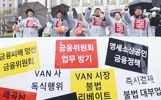 28일 서울 중구 금융위원회 앞에서 소상공인연합회 관계자들이 VAN시장 구조개선을 통한 카드수수료 인하 촉구 결의대회를 하고 있다.