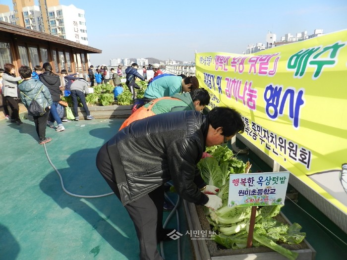경기 부천시 심곡2동 주민자치위원회는 최근 이틀에 걸쳐 주민센터 옥상텃밭에서 재배한 배추 500포기를 수확해 소금에 절이고 김문호 시의장과 이형순 시의원, 노인회장, 각 단체원 등 50여명이 참석한 가운데 김장을 담그는 '김장 김치 담기와 나누기' 행사를 개최했다. 사진은 행사 첫 날 참가자들이 배추를 소금에 절이고 있는 모습. (사진제공=부천시청)
