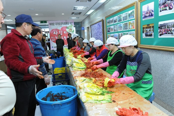 '대한민국 상이군경회 구리시지회'는 최근 경기 구리시 보훈향군회관 1층 로비에서 '전몰군경 미망인회' 회원들과 함께 별도로 마련된 특별행사장에서 배추 250포기를 담그는 '사랑의 김장 나누기 행사'를 펼쳤다. 사진은 이날 김장행사에 참가한 회원들의 모습. (사진제공=구리시청)