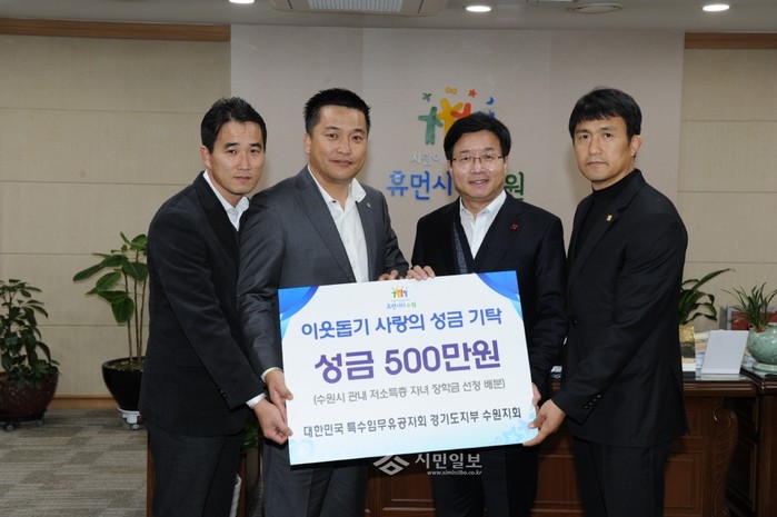 '대한민국 특수임무유공자회 수원시지회'가 최근 회원들이 경호, 경비, 청소, 가로 정비, 방역소득 등의 사업을 통해 모은 수익금 500만원을 지역내 어려운 학생들을 위한 장학금으로 수원시에 기탁했다.(사진제공=수원시청)