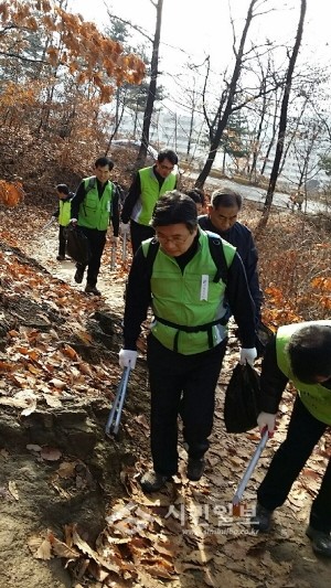 지난 11월29일 경기 성남시 6급 이상 승진자 63명이 12~14명씩 5개 조로 나눠 남한산성, 영장산, 불곡산, 청계산 등산로의 쓰레기를 치우고 운동기구, 의자 등 시설을 정비하는 ‘등산로 정비 활동’을 실시했다.(사진제공=성남시청)