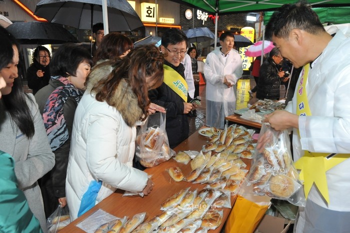 지난 11월28일 낮 12시 서울 노원구 노원문화의거리에서 (사)대한제과협회 노원도봉지회가 어려운 이웃을 돕고 동네 빵집을 알리기 위해 '동네 빵집 디어블랑제 빵 기부행사'를 열었다. 사진은 행사에 참석한 김성환 구청장이 빵을 구매하고 있는 모습. (사진제공=노원구청)