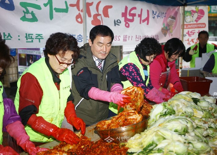 최근 임춘대 송파구의회 의장은 석촌시장에서 열린 '사랑의 김장나눔 행사'에 참석해 석촌시장 상인회 회원들과 함께 김장김치를 만들었다. 이 김치는 지역내 경제적으로 어려운 이웃들에 전달돼 겨울나기를 돕게 된다. 사진은 김치 담그기에 참여한 임 의장(오른쪽)의 모습. (사진제공=송파구의회)