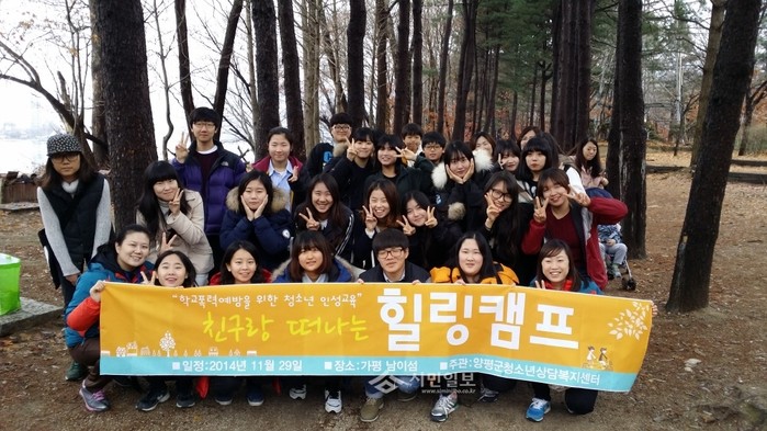지난달 29일 경기 양평군 청소년상담복지센터가 지역내 청소년들을 대상으로 '지역단위 학교폭력예방 및 근절사업'의 일환으로 '친구랑 떠나는 힐링캠프'를 실시했다. 참여자들은 다양한 볼거리를 체험하며 서로간의 우애를 다지는 시간을 보냈다. 사진은 참여자들이 기념촬영한 모습. (사진제공=양평군청)