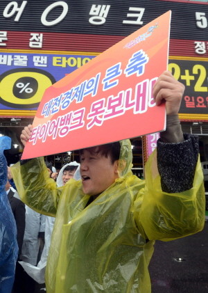 대전 향토기업인 타이어뱅크가 대전 본사를 옮기려고 해 1일 오전 대전 용문동 타이어뱅크 본사 앞에서 대전시 공무원 및 1일 기업도우미들이 타이어뱅크 이전을 철회하라는 팜플렛을 들고 서있다.