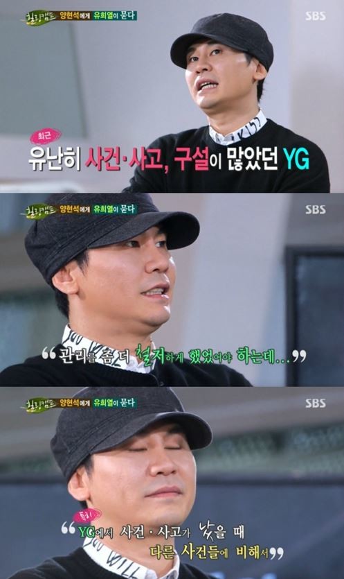 이에 양현석은 "일단 먼저 창피하다"고 조심스럽게 말문을 열었다. 이어 "솔직히 안 일어나도 될 일들이 자의적 타의적으로 일어났다. 관리를 조금 더 철저하게 했어야 하는데 다시 한 번 죄송하다는 말씀 드리고 싶다"고 사과의 마음을 전했다.