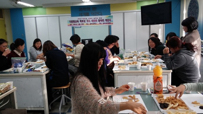 인천 동부교육지원청은 12월 한 달 동안 ‘2014 다문화교육 행복한 학부모 푸드 테라피 동아리’를 운영하기로 한 가운데 지난 1일 개강식을 열고 '푸드 심리 테라피에 대한 이해' 등 '만남의 장'을 진행했다. 사진은 이날 교육에 참가한 다문화 가정 및 학부모들의 모습. (사진제공=동부교육청)