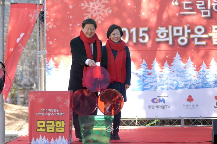 중구는 저소득 주민이 추운 겨울을 따뜻하게 보낼 수 있도록 2일 오전 11시 구청광장에서 C&M 케이블TV와 함께 '2015 희망온돌 따뜻한 겨울나기 모금 생방송 행사'를 열었다. 사진은 최창식 중구청장(왼쪽)이 성금을 넣고 있는 모습. (사진제공=중구청)