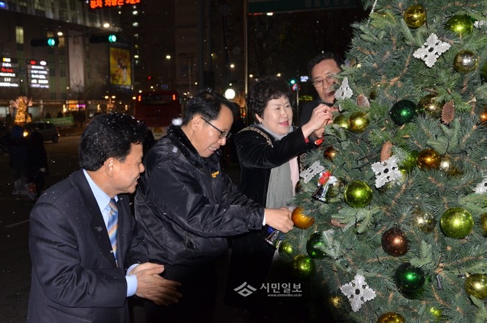 지난 1일 서울 영등포소방서가 남·여의용소방대장과 영등포소방서 직원이 참석한 가운데 영등포소방서 정문에서 겨울 분위기를 북돋우고 오는 2015년 시민의 안전을 기원하는 트리 점등식을 열었다. 사진은 트리에 장식품을 다는 관계자들의 모습. (사진제공=영등포소방서)