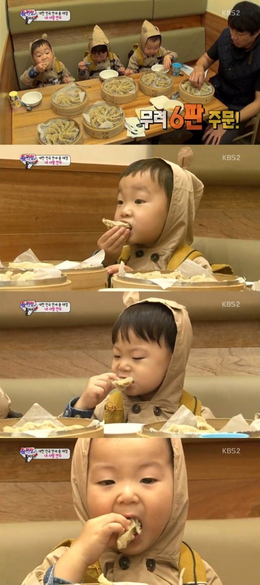 이날 방송에서 송일국은 만두 여섯판을 시켜 혼자 세판을 먹고 삼둥이들은 각각 만두 한판씩을 해치웠다.